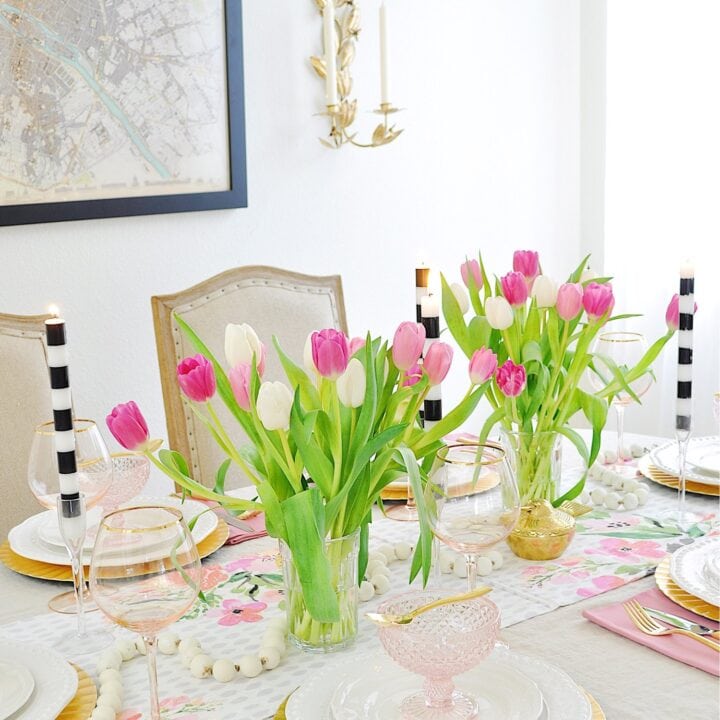 Pink and white tulips, black and gold candles, and soft blush accents bring a playful yet sophisticated look to this spring table.