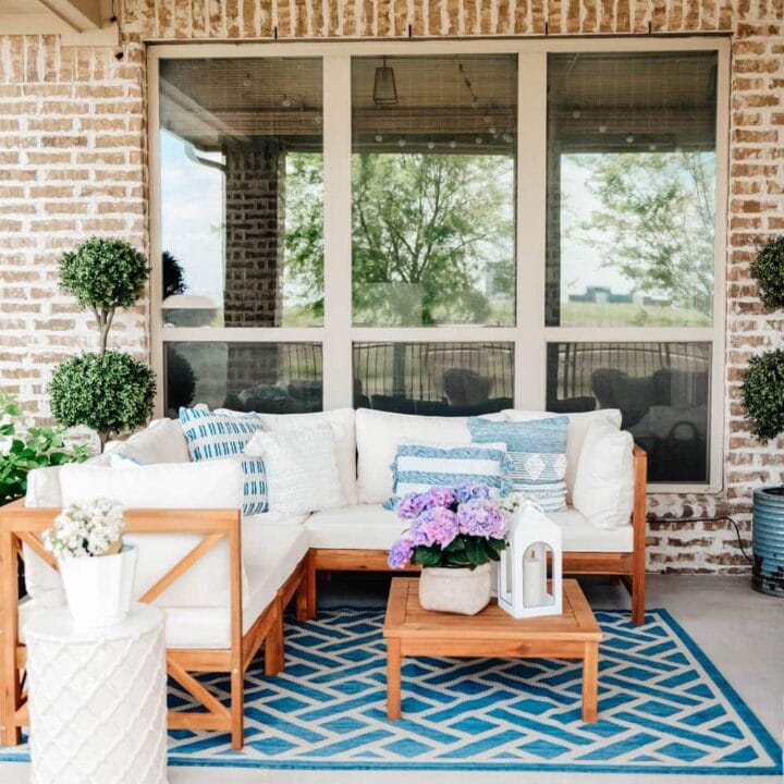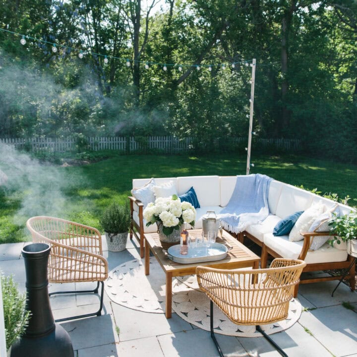 Complete your patio setup with personal touches, such as an outdoor rug to unify the space and outdoor decor finds for summer like a piece of outdoor art or a small water feature to add charm.