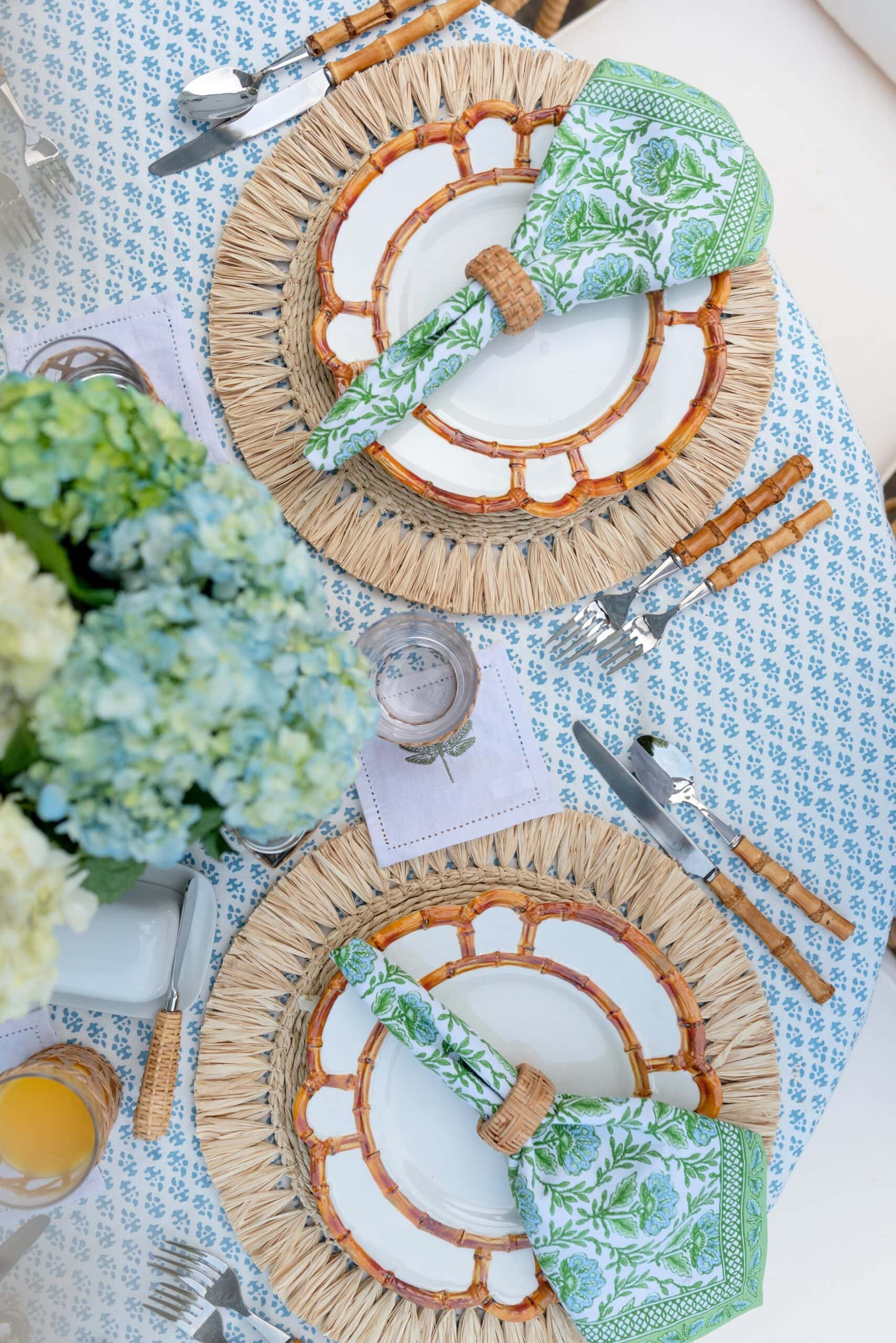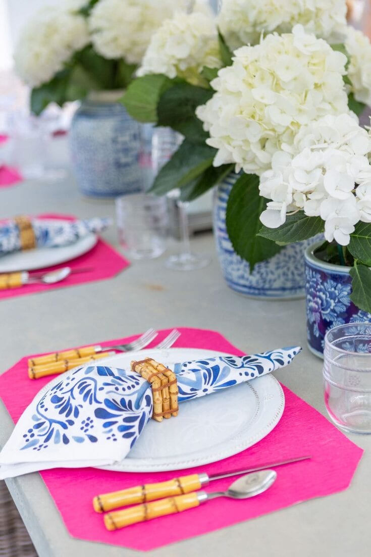 Blue and white napkins with bamboo flatware sit on crisp white plates and bright pink placemats for a fun summer pop.