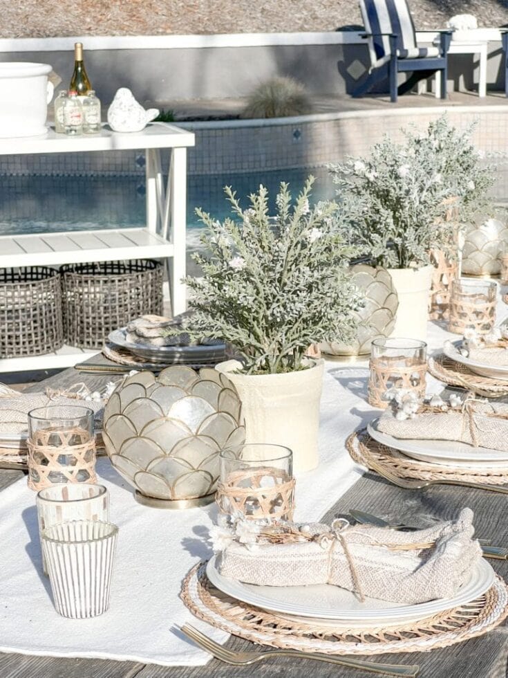 With soft white linens, cozy textures, and neutral-toned greens, this table feels like a breath of fresh air by the water.