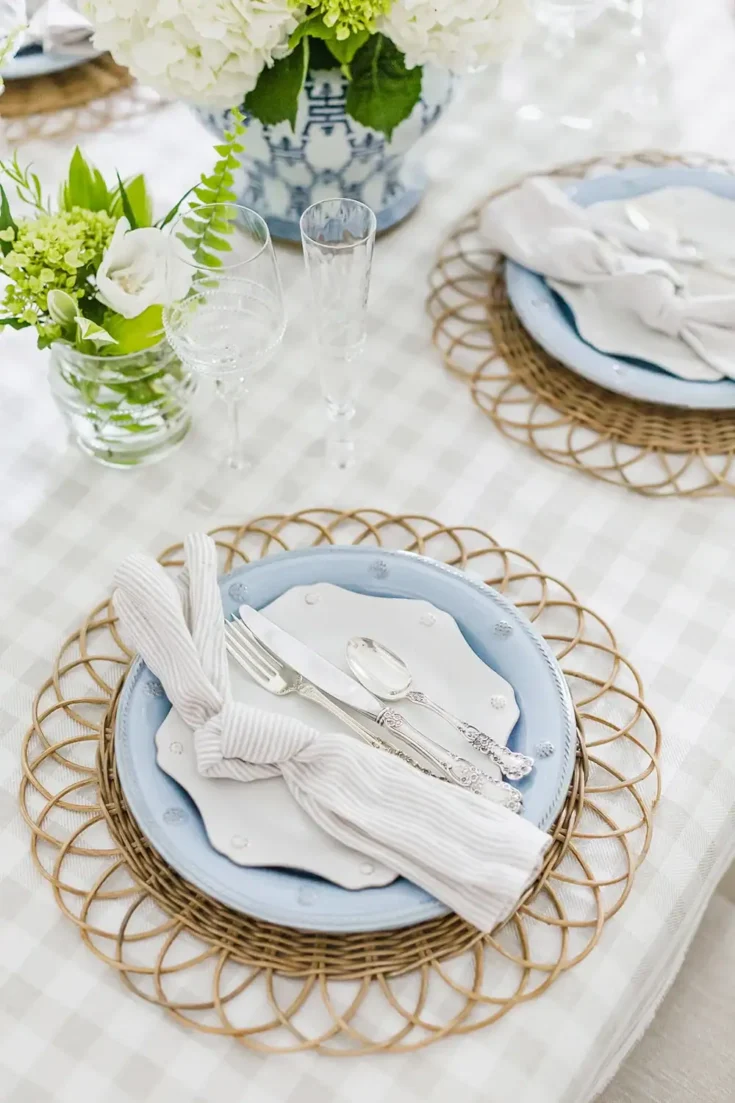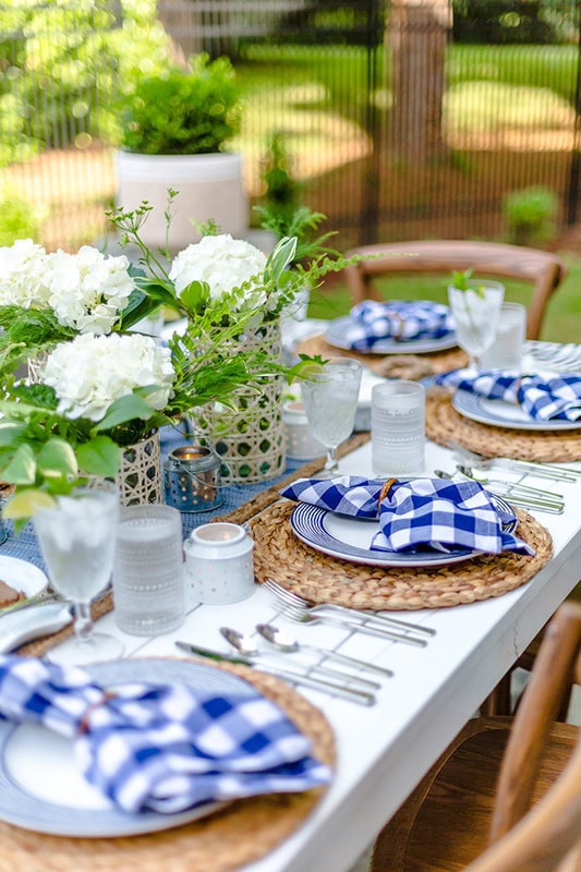 With checkered napkins, white hydrangeas, and woven chargers, this table feels cozy, classic, and totally easy to recreate.