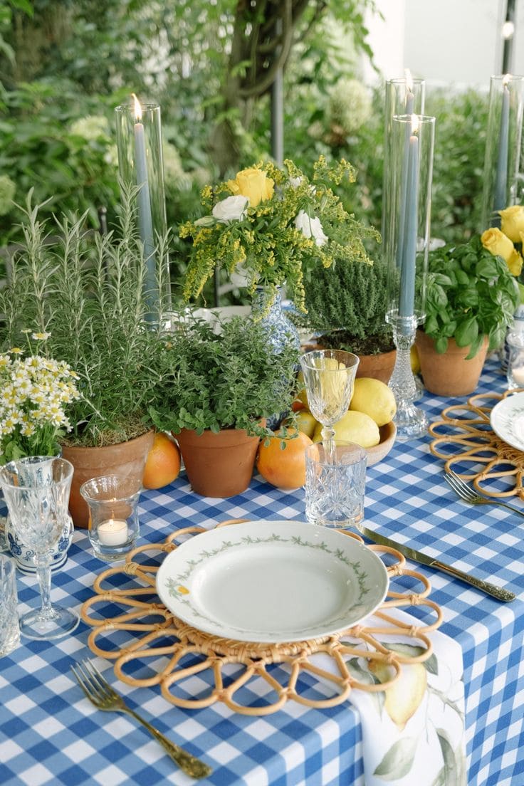 This table is packed with potted herbs, yellow flowers, and juicy citrus tucked in between candles and glassware.
