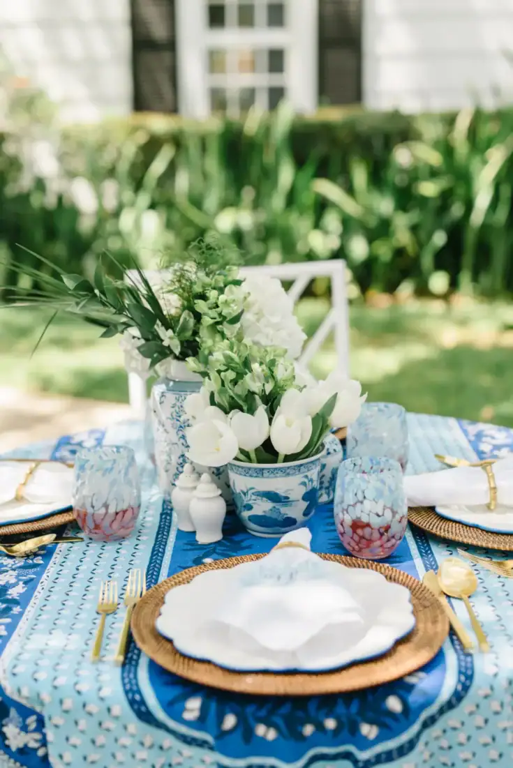 White Floral Centerpiece, Blue Patterned Tablecloth, and Gold Accents