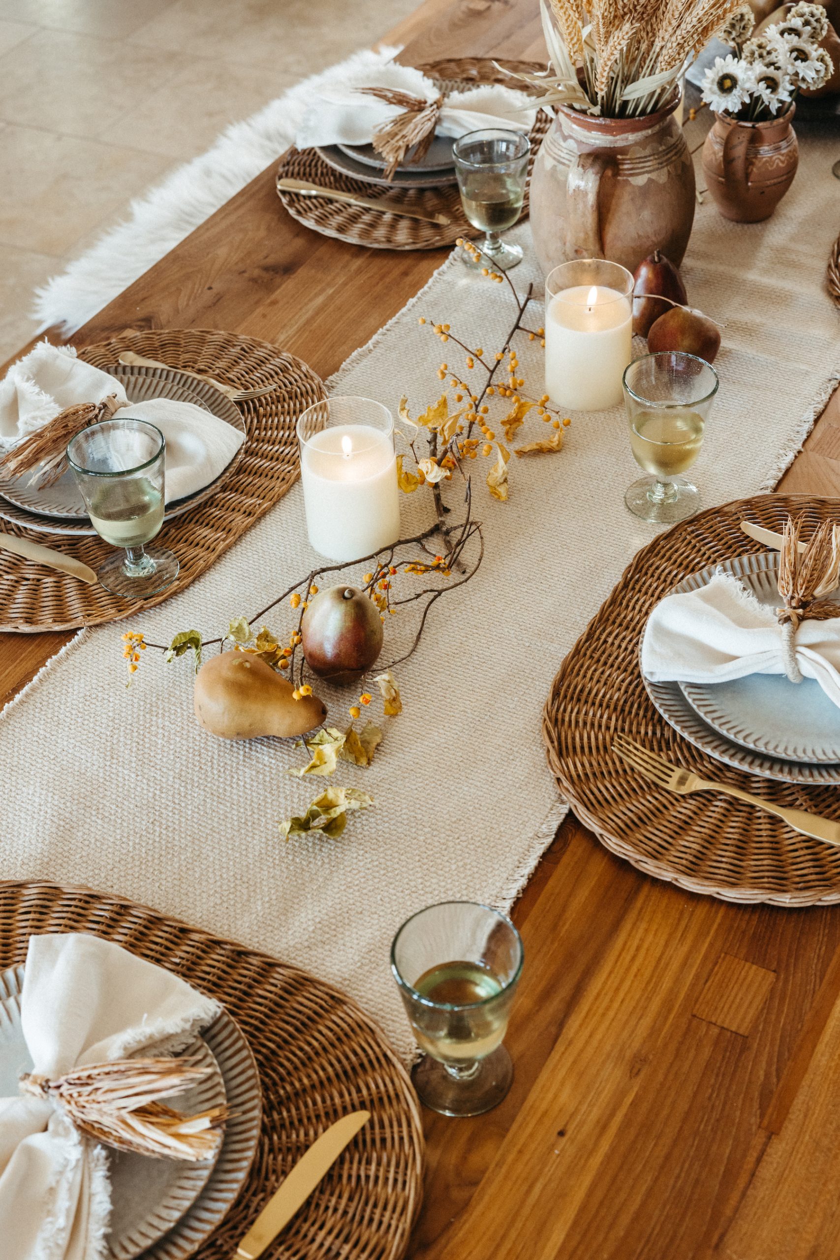 Start with a wooden table or a natural-looking table runner that highlights the textures of fall decor without covering them up too much.