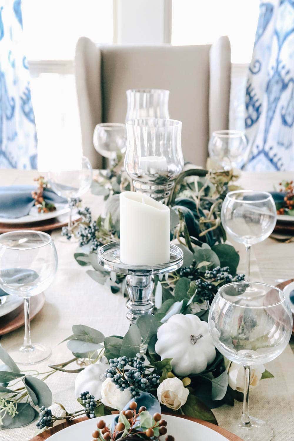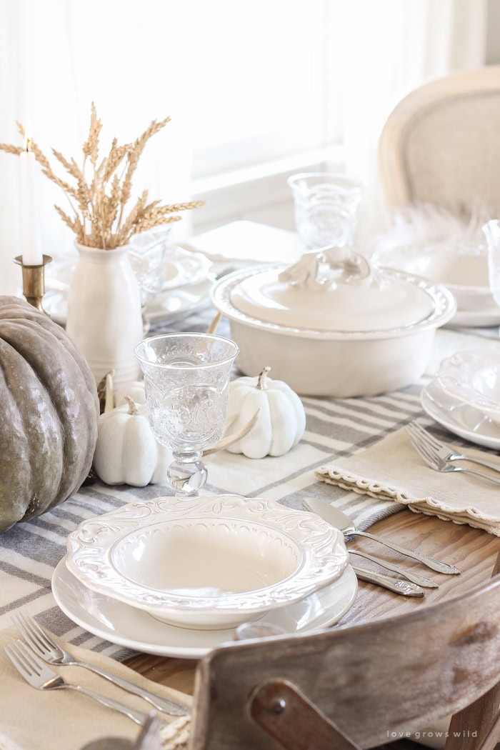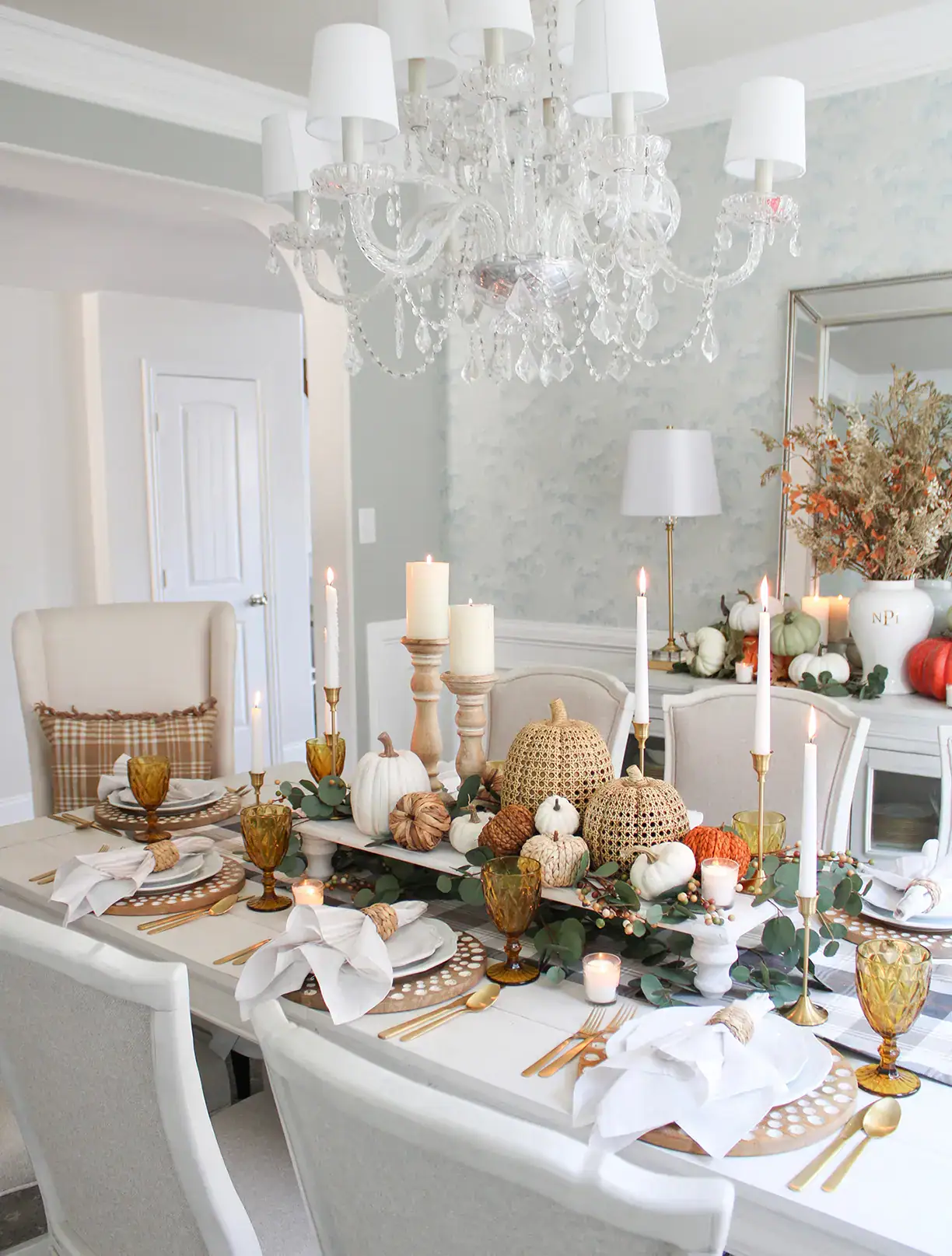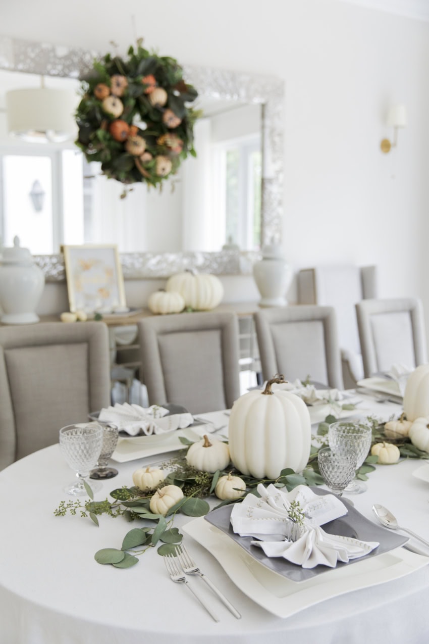 Adding natural elements like white pumpkins, greenery, or dried flowers brings soft texture while maintaining the understated look of a refined tablescape.
