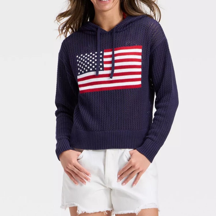 NAVY CROCHET-KNIT HOODED SUMMER FLAG SWEATER