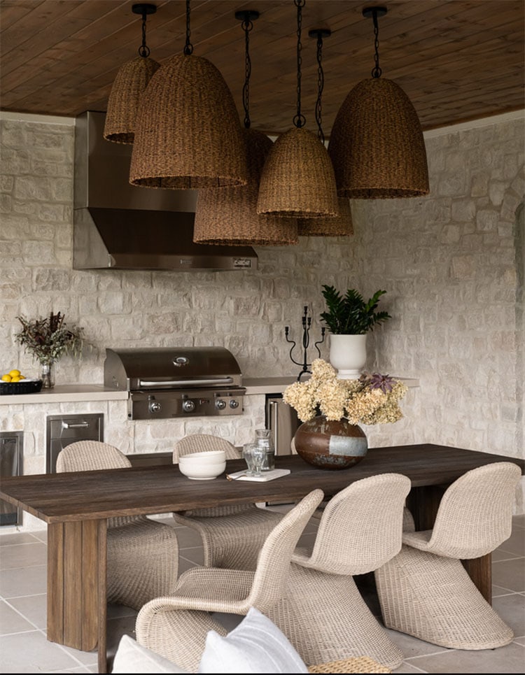 1. This stunning outdoor living area designed by Emily Handke Interiors is so dreamy! I love that it’s seemingly styled for fall, so you can get an idea of how to style your outdoor living space this upcoming fall if you live somewhere that stays warm enough to do so for another month or two, at least! I love the seating setup and those light fixtures are just so unique and beautiful! Check out more of her beautiful spaces here.