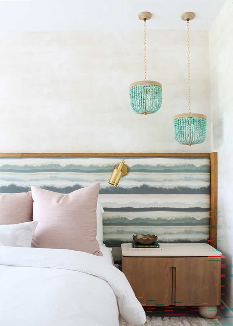 1. This stunning bedroom designed by Nikky Levy Interiors is a part of one of the most beautifully designed homes I have seen in a long time! This bedroom is a work of art – the textured wallpaper, colors, and chandeliers and the placement of them above the bed is SO well done. I just love the way it looks! Check out the entire home here.