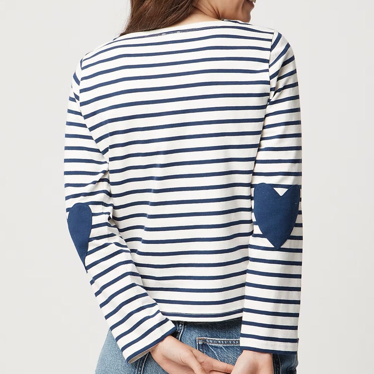 BLUE BOATNECK STRIPED TOP WITH HEART SHAPED ELBOW PATCHES