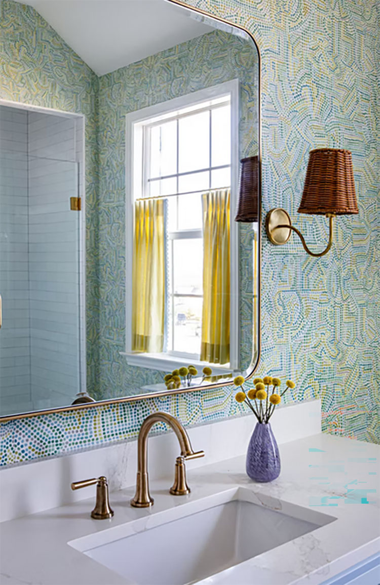 - This stunning wallpapered bathroom designed by The Collective Interiors is so beautiful – the hues of blues and greens are so stunning together and those rattan sconces are such a fun finishing touch! Check out more of the beautiful home here.