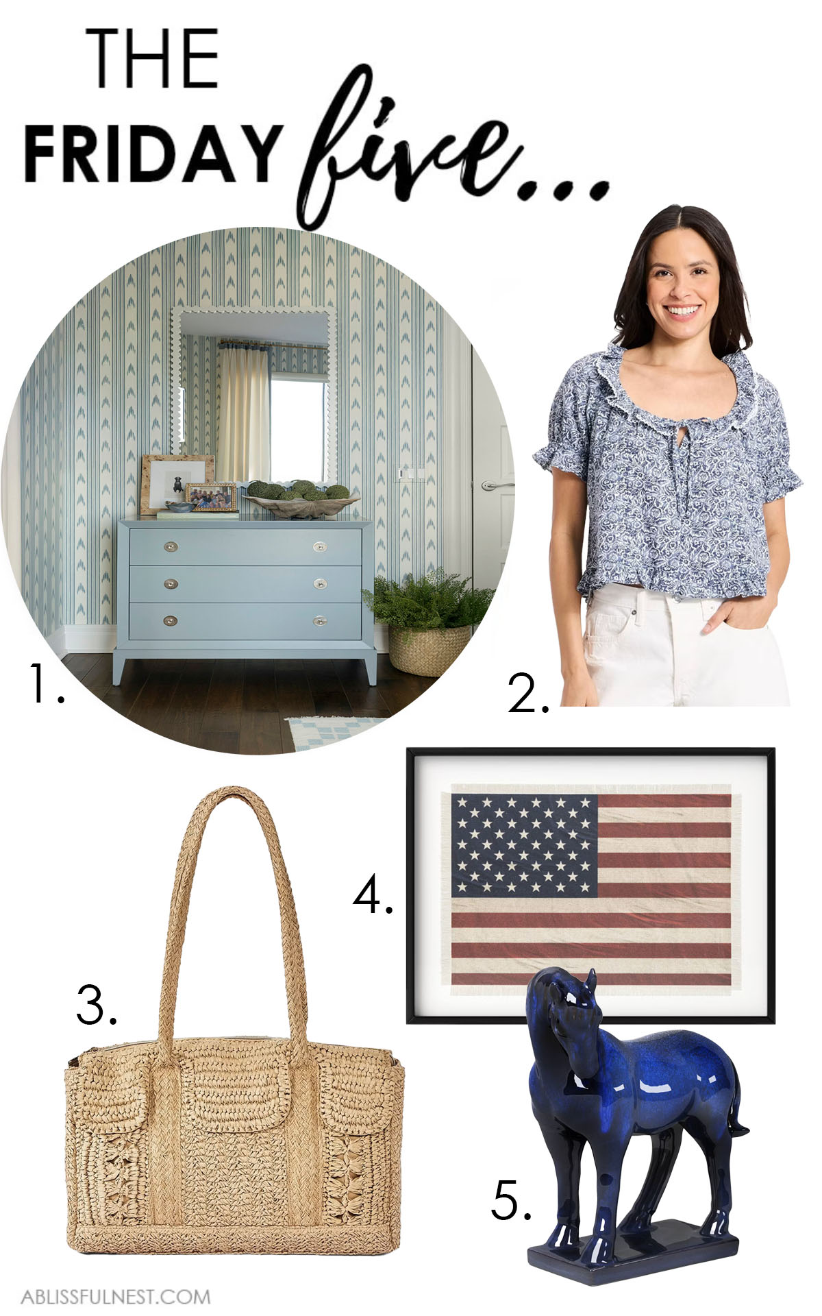 This week I am sharing a stunning wallpapered bedroom, the prettiest floral blouse, a must have straw bag for summer and two Americana home pieces to add to your entryway (or anywhere!) in your home this season!