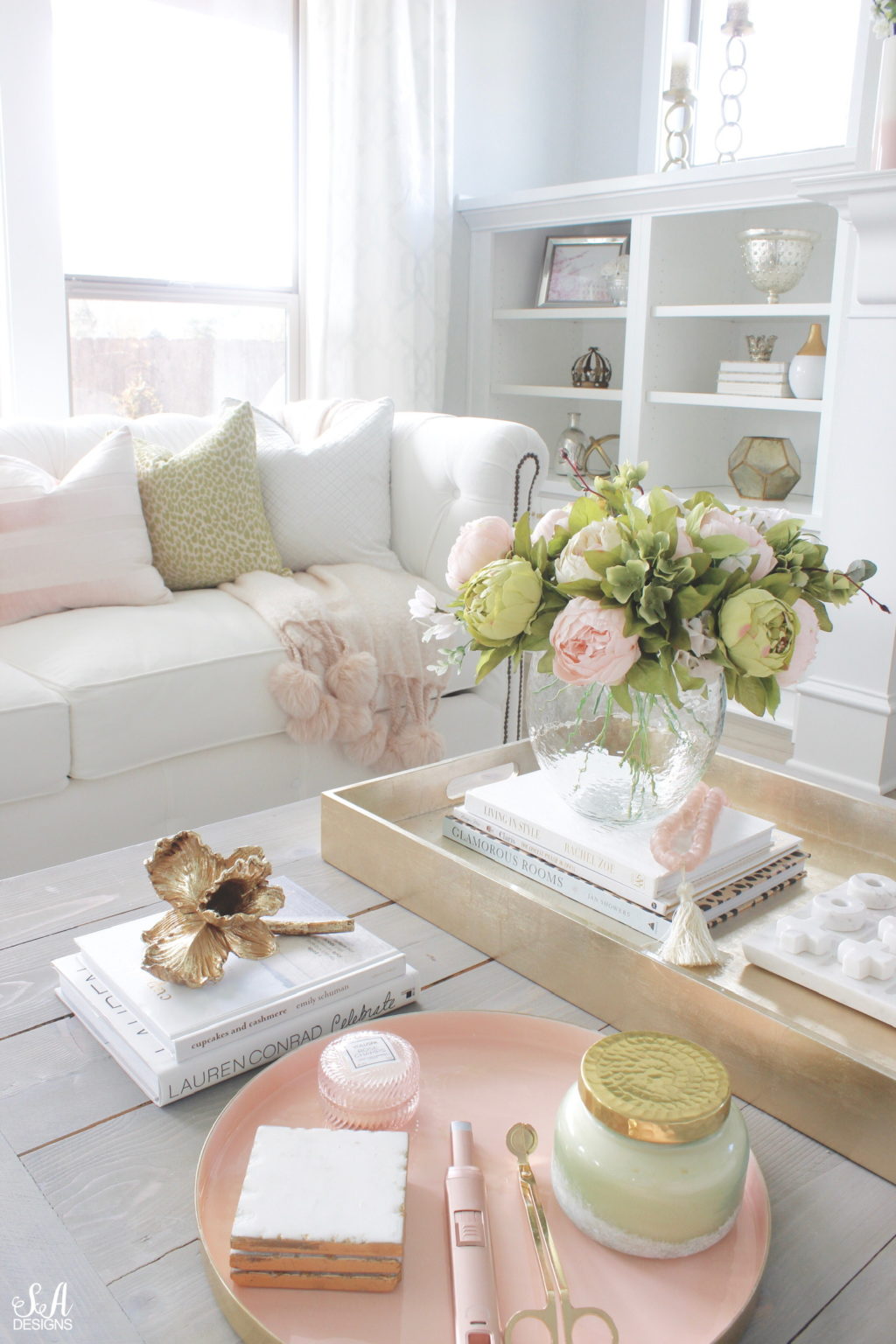 Fresh flowers or even faux stems in pretty vases bring life and beauty to your coffee table or side tables without taking up too much space.