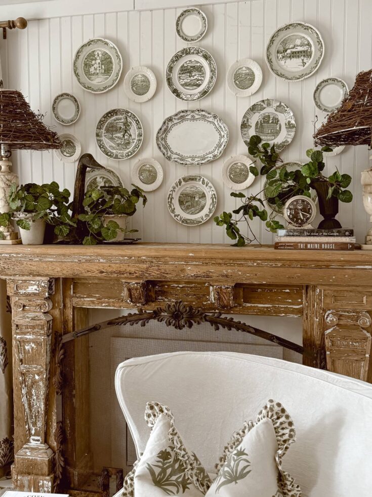 This plate wall mixes green-and-white vintage dishes with leafy plants and a weathered wood mantel, giving your space a collected-over-time, cozy farmhouse feel.