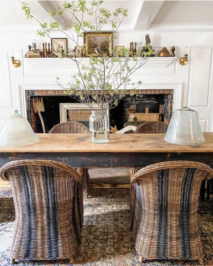 This dining area features wicker chairs, a simple wood table, and a mantel styled with art, greenery, and vintage finds.