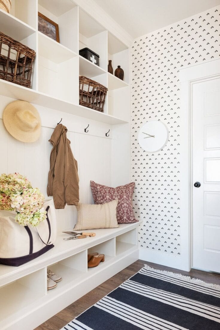 This tidy mudroom has wicker baskets, hooks for coats, and patterned wallpaper that makes even a simple entryway feel styled and cheerful.