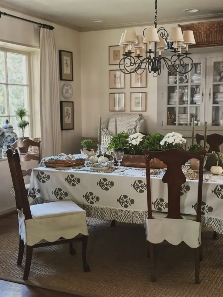 A soft botanical tablecloth, cozy slipcovered chairs, and a leafy centerpiece make this dining space inviting enough for everyday meals or special celebrations.