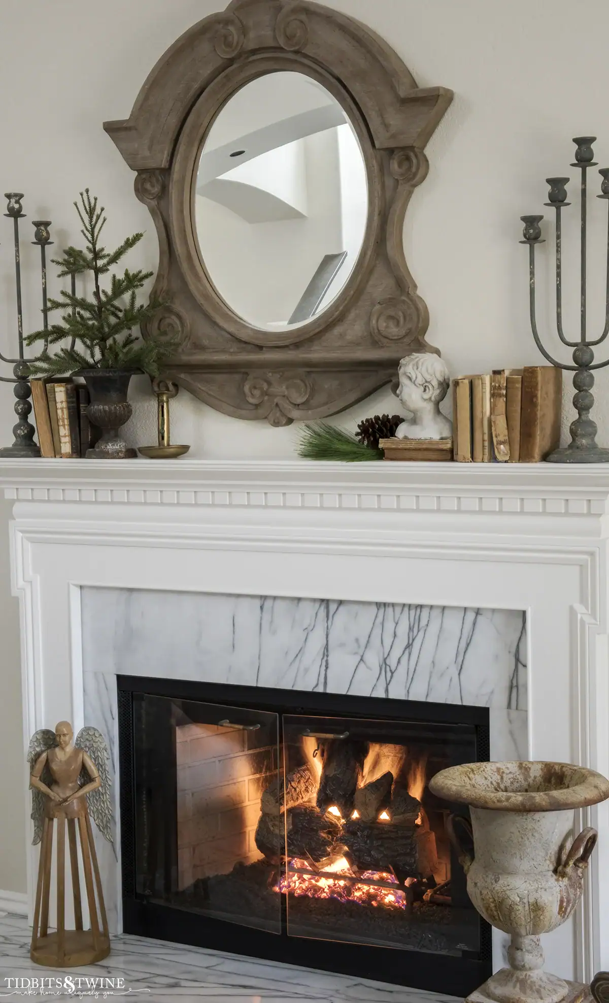 Choose a few grounding pieces for your winter fireplace mantel, like warm wood accents or a simple mirror that helps create a natural focal point.
