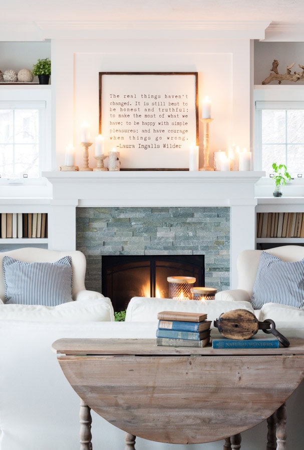 This time of year can feel a little quiet, so adding winter white decor to your mantel helps keep the living room warm and inviting again.