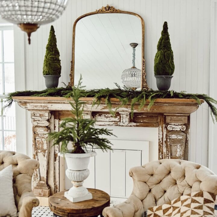 A rustic mirror with evergreen touches on a vintage-style mantel adds so much character and charm, making this setup feel like you’re stepping into a cozy, old-world winter scene that’s filled with warmth and timeless beauty.