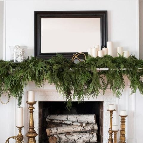 With layers of fresh greenery and warm candles in different heights, this look brings a classic and cozy winter vibe that makes any space feel inviting, and those birch logs tucked into the fireplace add just the right rustic touch.