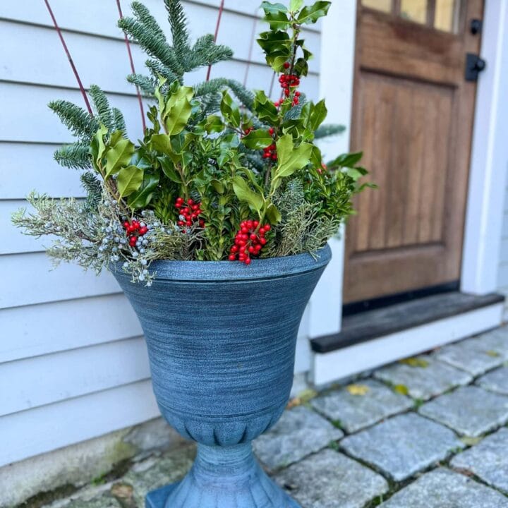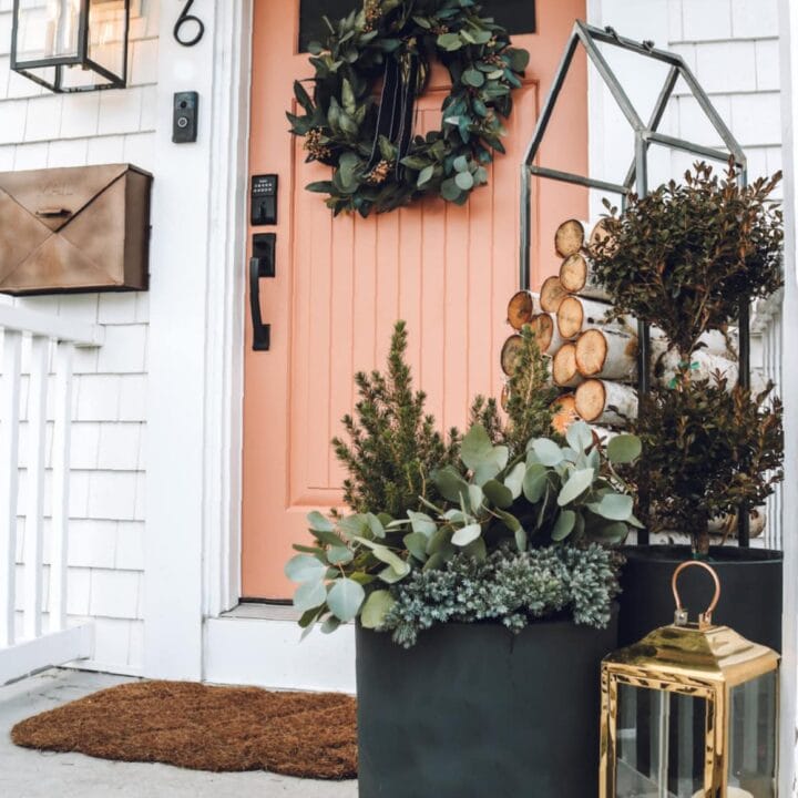 This festive planter, filled with faux greenery and red berries, brings such a bright and cheerful vibe to your front porch!