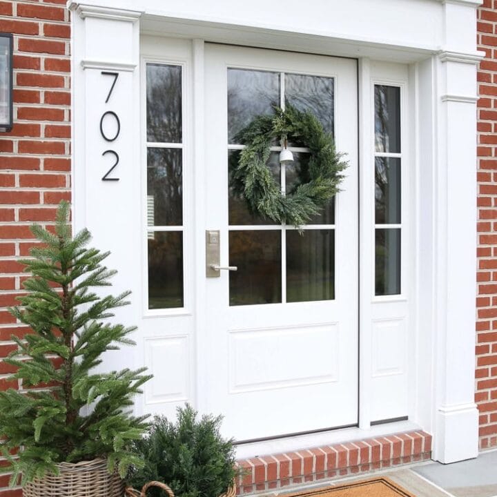 This simple green wreath and potted faux evergreens are all about keeping that clean, classic holiday look with no effort at all.