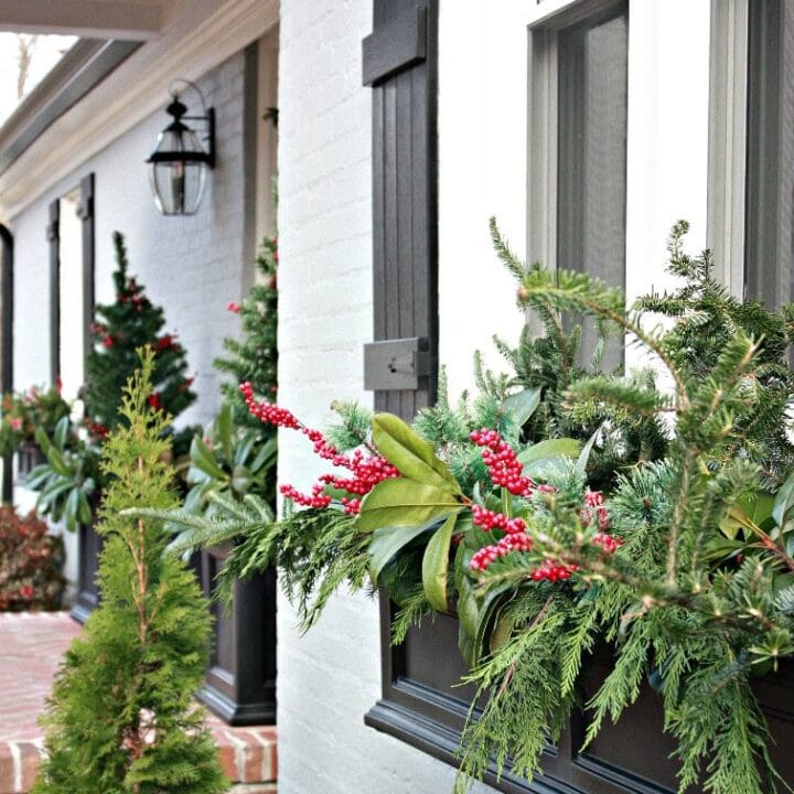 The mix of greenery and bright red berries in these window boxes instantly adds a festive pop.